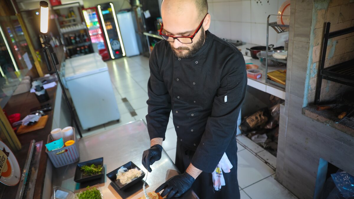 — Depois a gente desfia e usa os ossos para fazer um caldo que a gente esquenta a costela. Usamos uma massinha de pastel frito, temperadinha como uma base, que é o crostini, e também gratinamos os queijos, damos uma defumadinha neles, fazemos um creme e montamos um disco. Vai a costela, o creme de queijo e os micro verdes que são produzidos aqui em Floripa — explica.