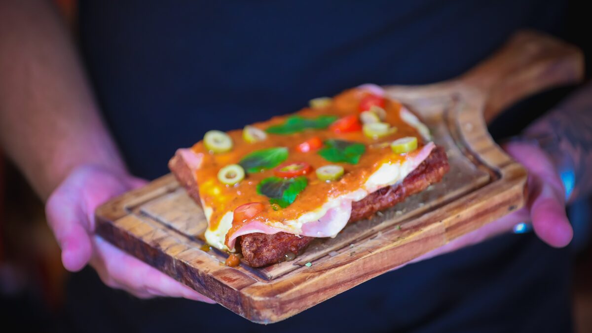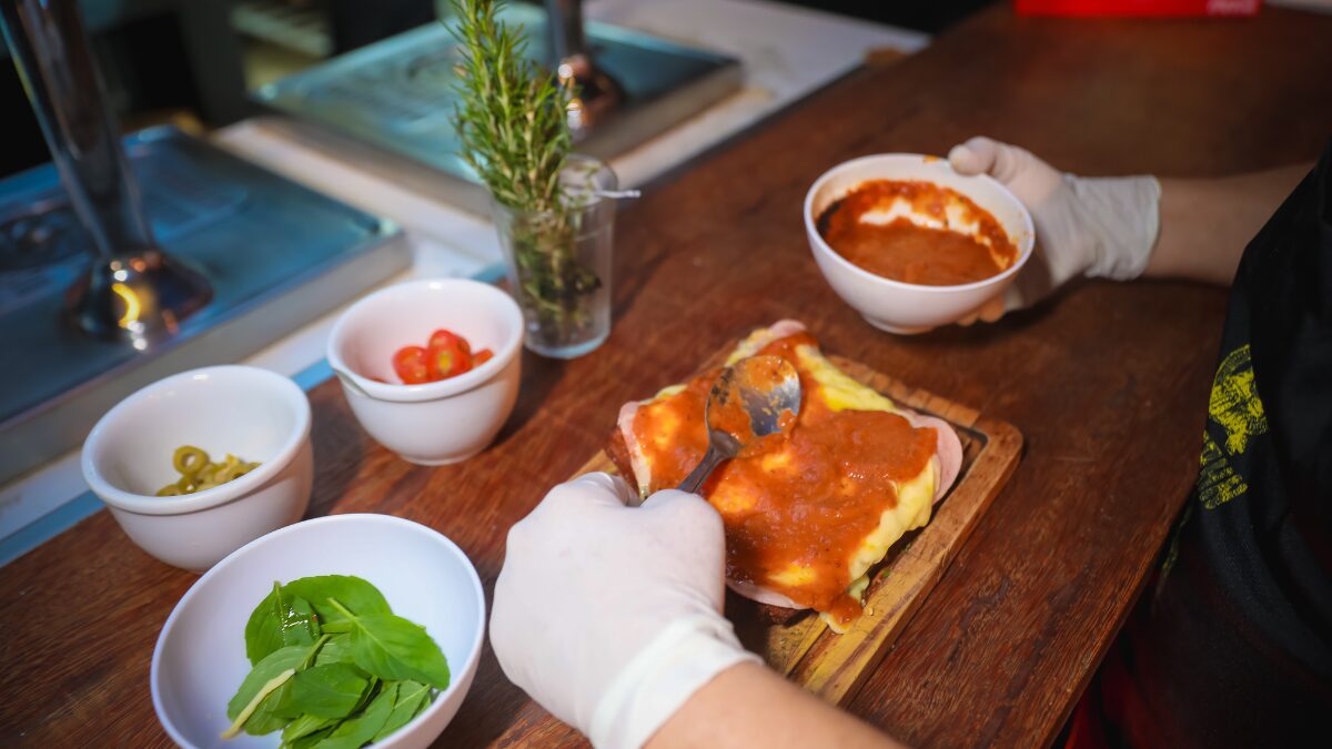— A montagem do prato primeiro é o matambrito. Ele se empana como uma milanesa normal. No final é colocado o presunto e o queijo. Por cima, termina com o molho de tomate caseiro, com um pouquinho de azeitonas e tomate cereja, e um pouquinho de manjericão para dar um gostinho diferente.