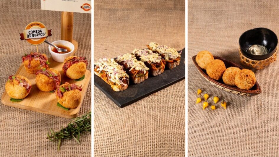 Petisco: Raízes Nordestinas – Espetinho de bovino e espetinho de queijo coalho. Acompanha vinagrete e macaxeira.