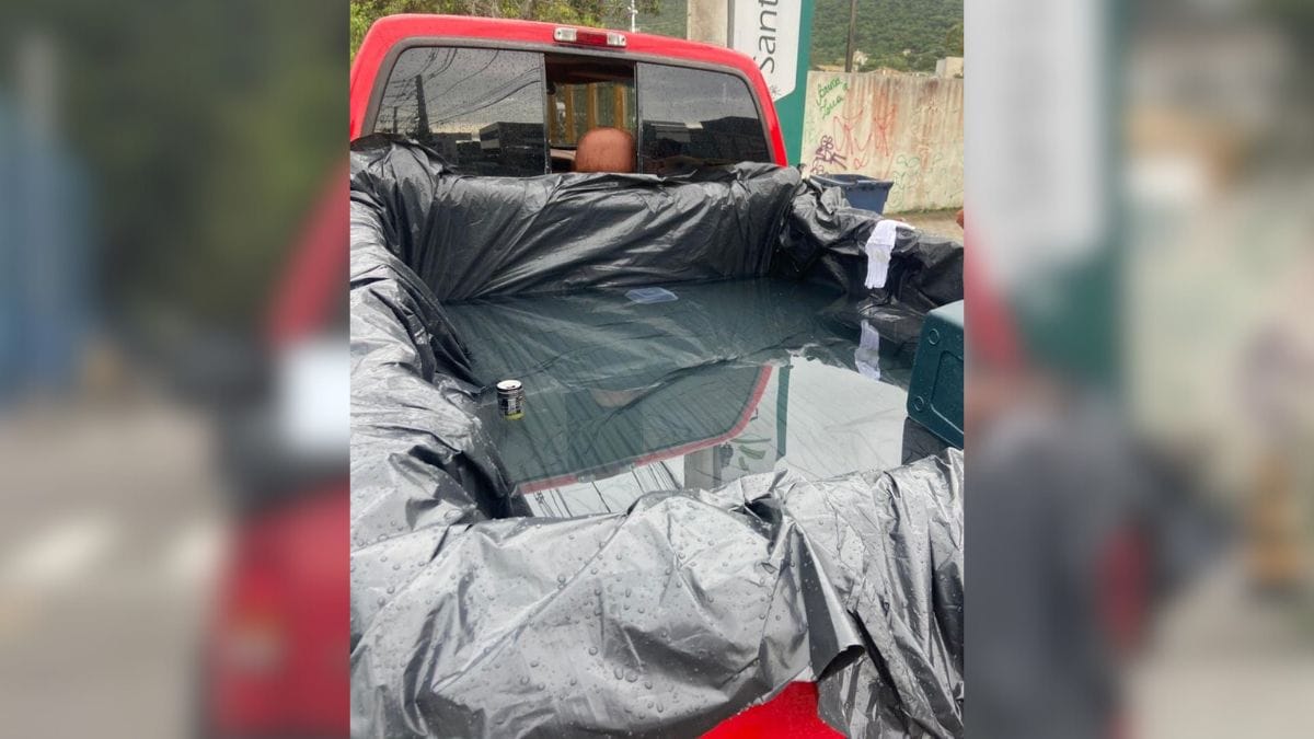 Na foto, é possível observar que colocaram uma lona para conseguir encher a caçamba da Ford F250. Três pessoas estavam dentro da água, onde tinha, inclusive, um cooler e bebidas. Durante a abordagem, o motorista se negou a fazer o teste do bafômetro e também estava com o licenciamento atrasado.