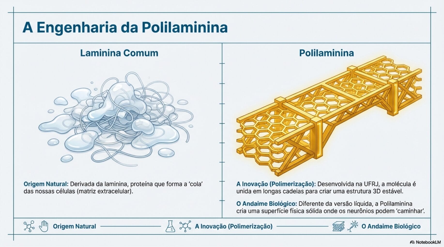 Diferente da laminina comum, a polilaminina cria uma estrutura tridimensional estável. Imagine que a lesão na medula é como uma ponte caída; a polilaminina funciona como um andaime biológico, permitindo que os neurônios “caminhem” sobre ela para atravessar o vão da lesão e se reconectar.