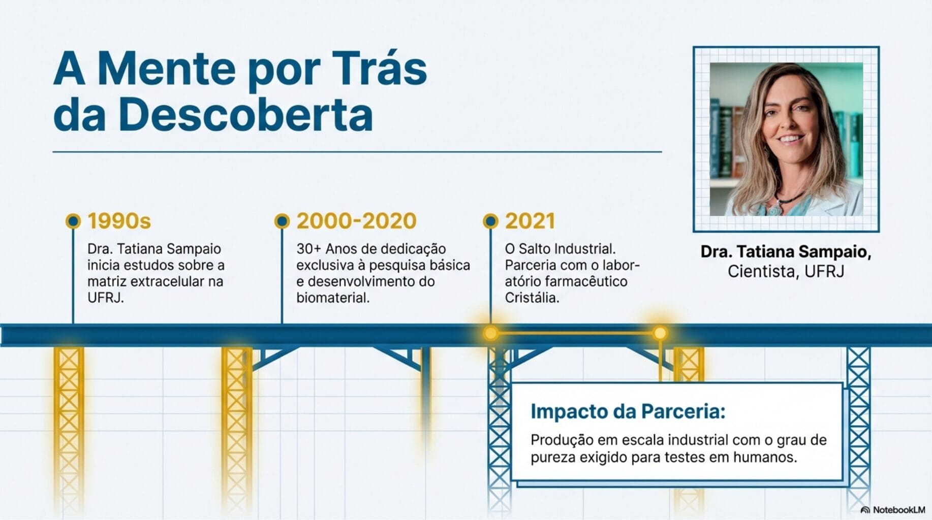 A liderança científica desse projeto pertence à Dra. Tatiana Sampaio, bióloga e professora titular da UFRJ. Com uma trajetória iniciada na década de 90, ela dedicou mais de 30 anos ao estudo da matriz extracelular.