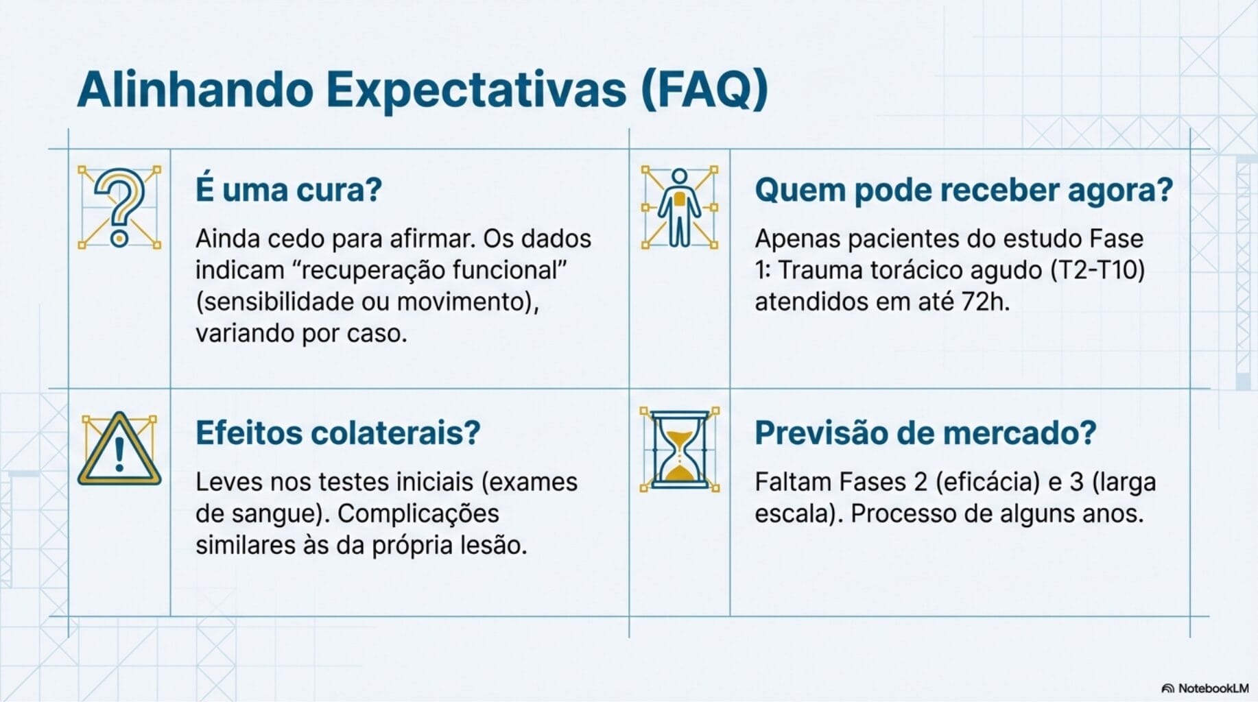 - Foco: Esta fase testará a segurança em 5 novos pacientes com traumas torácicos recentes (menos de 72 horas após o acidente).