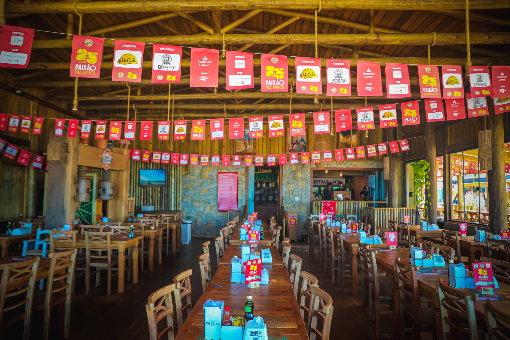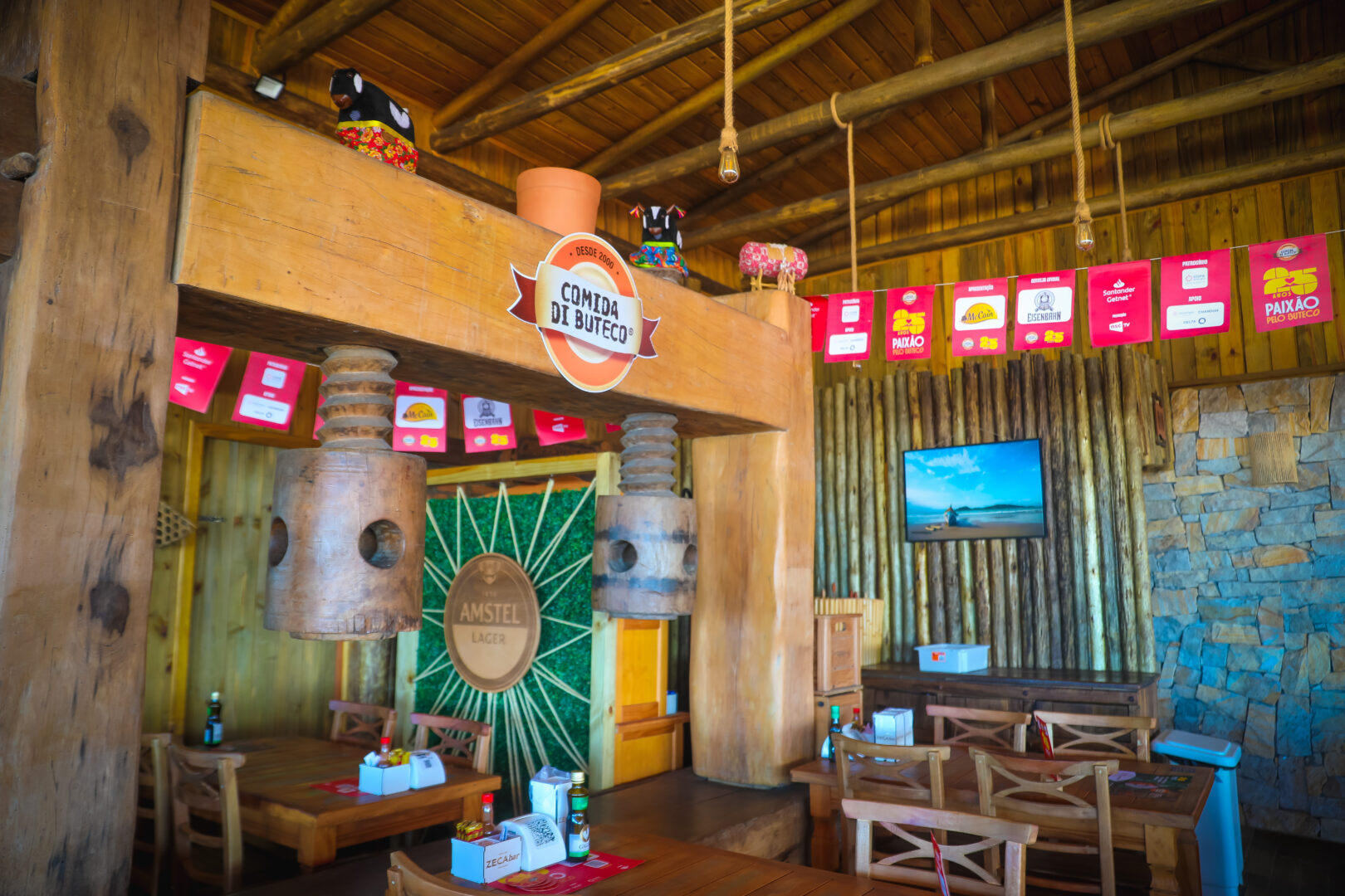 O grande salão tem um teto alto, forrado de madeira, e conta com decoração tradicional que inclui miniaturas de Boi-de-Mamão e um antigo moedor de engenho, trazido do interior. Fotos e pinturas da família decoram o local, com destaque para um mural na entrada com o rosto do seu Zeca.