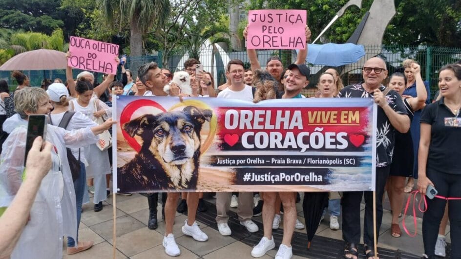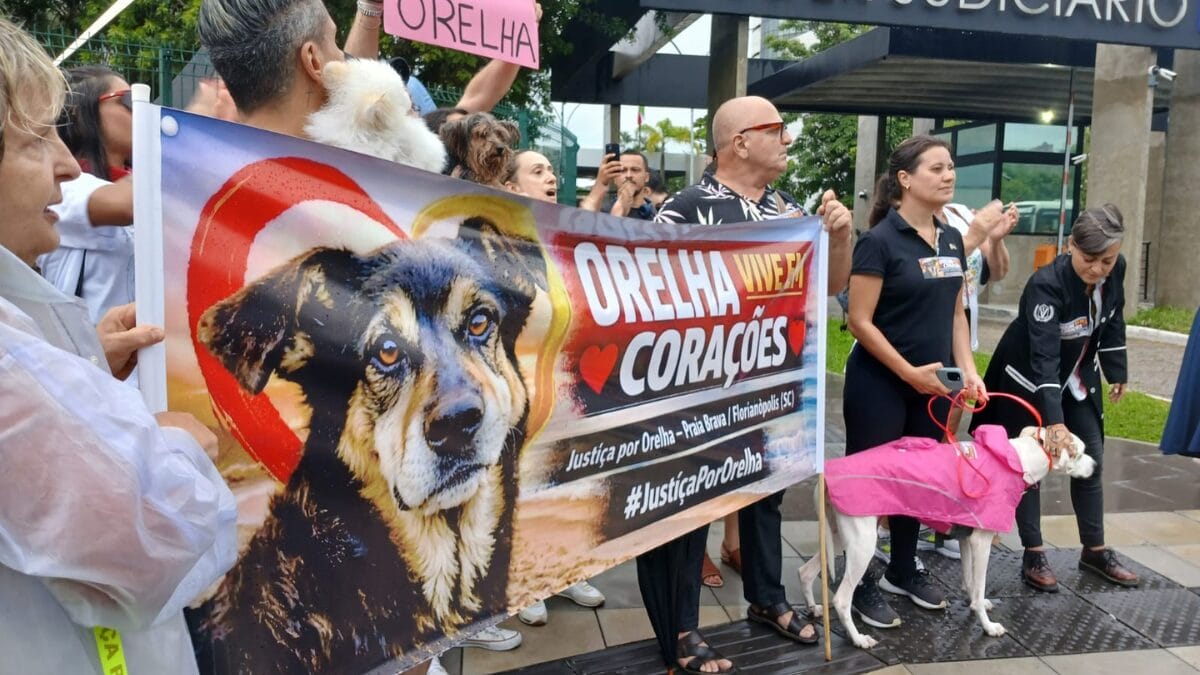 Cerca de 100 pessoas se reuniram em um protesto nesta quinta-feira (29) pela morte do cão Orelha, ocorrida no bairro Praia Brava, em Florianópolis, no início de janeiro. A manifestação aconteceu em frente ao Tribunal de Justiça de Santa Catarina (TJSC), com gritos de palavras de ordem pedindo por justiça pelo animal. Quatro adolescentes são suspeitos pela morte do cachorro, segundo a Polícia Civil.