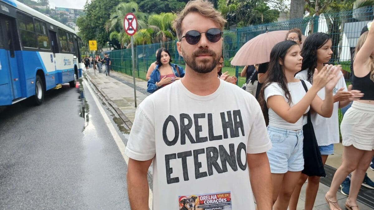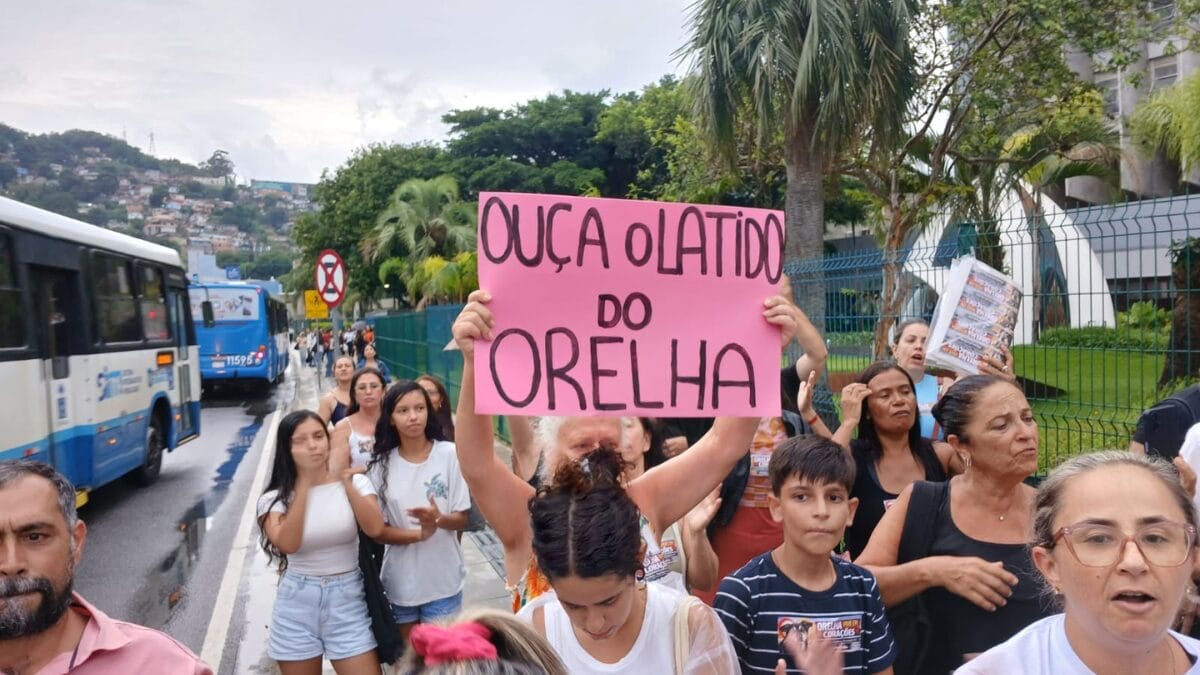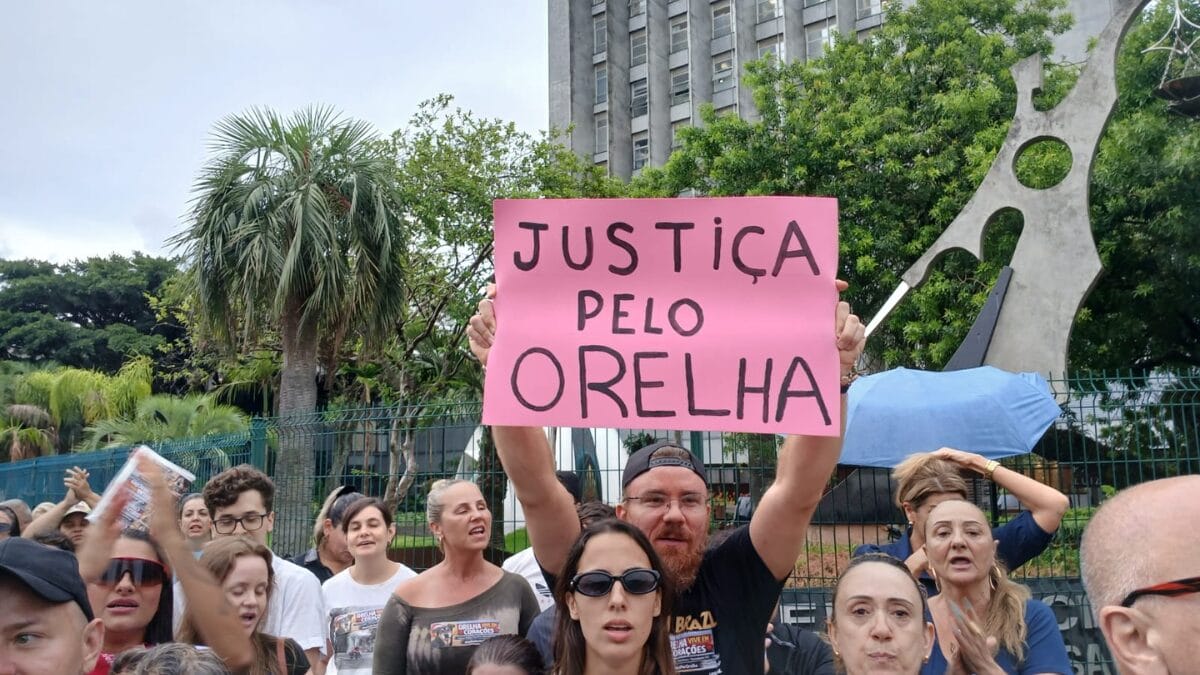 Os manifestantes seguravam um cartaz com os dizeres “Orelha vive em corações”, com a foto do cachorro. Os presentes também levaram cachorros ao protesto.