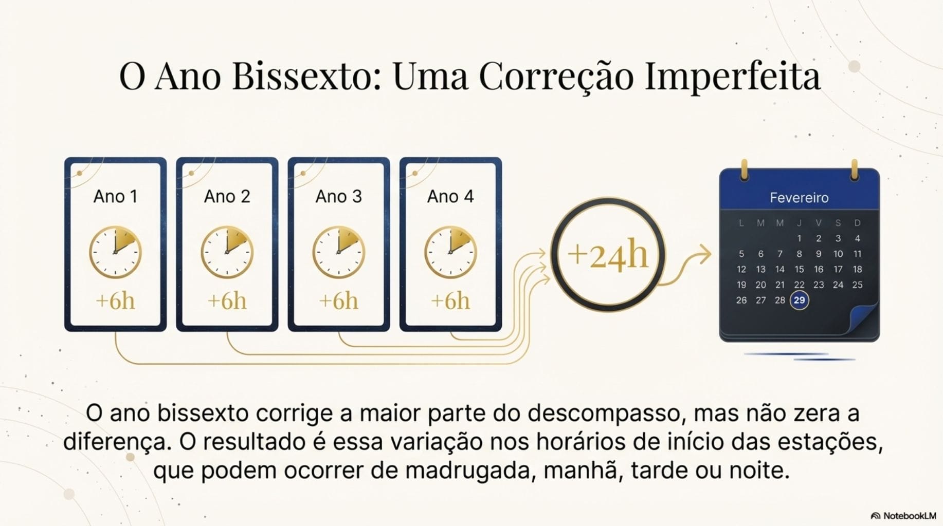 O conflito fundamental está entre o ano civil, com seus 365 dias redondos, e o ano tropical, que é o tempo que a Terra leva para dar uma volta completa ao redor do Sol. Esse percurso real dura aproximadamente seis horas a mais que o nosso ano civil. Essa diferença se acumula, fazendo com que o início de cada estação “atrase” cerca de seis horas a cada ano.