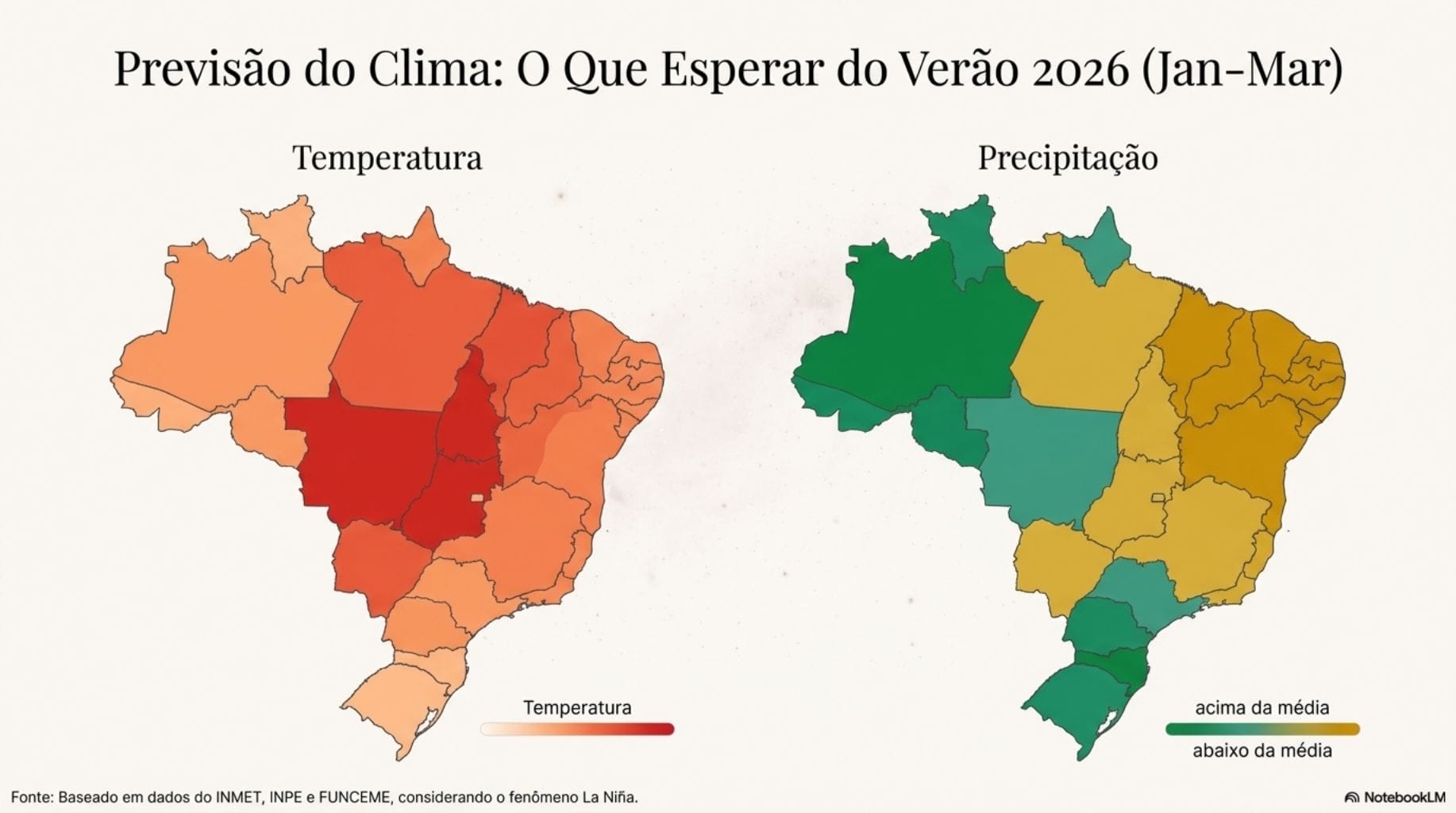 Mas o que podemos esperar especificamente para os próximos meses? Com base no prognóstico climático oficial conjunto dos principais órgãos de meteorologia do Brasil — o INMET, o INPE e a FUNCEME —, a previsão para o trimestre de janeiro a março de 2026 é a seguinte: