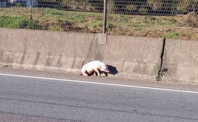 Um porco filhote caiu de um caminhão que transitava pela BR-101, em São José, na Grande Florianópolis, durante a tarde de domingo (23). Pessoas que presenciaram a queda conseguiram parar o trânsito da rodovia mais movimentada de SC e realizar o resgate do animal, que teve uma das patas quebradas com o tombo.