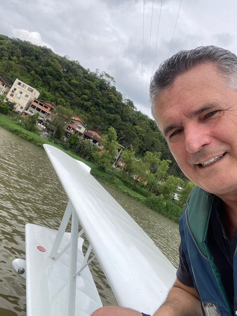 — Como sempre fui apaixonado por esportes aquáticos, adquiri um avião anfíbio Super Petrel LS. Costumo realizar pousos na Represa Alto Rio Preto, em Rio dos Cedros, mas sempre tive o sonho de pousar no Rio Itajaí-Açu — diz Volnei, entusiasmado.
