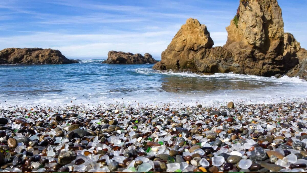 A Glass Beach fica em Fort Bragg, na Califórnia, e é famosa por ter o solo coberto por fragmentos de vidro polidos pelo mar em vez de areia comum.