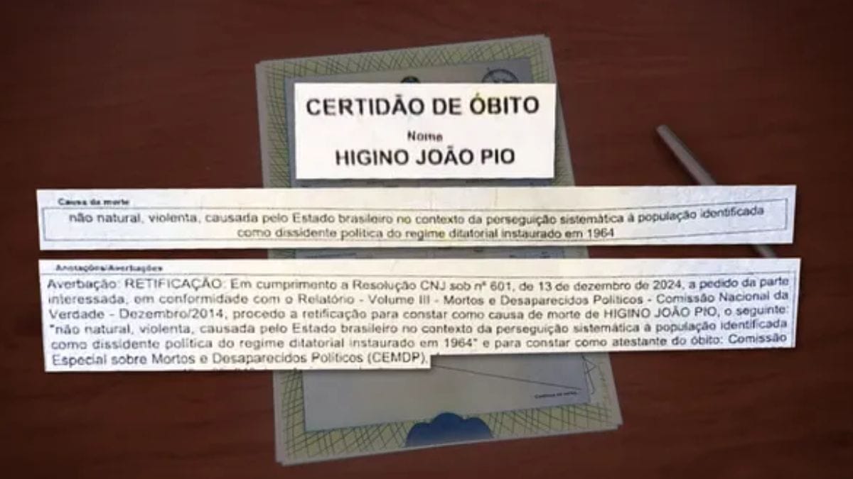 O documento teve a causa da morte alterada. Antes, o atestado afirmava que Higino Pio morreu por asfixia causada por enforcamento. A nova versão da certidão de óbito apresenta como causa da morte a explicação “não natural, violenta, causada pelo Estado brasileiro no contexto da perseguição sistemática à população identificada como dissidente política do regime ditatorial instalado em 1964”.