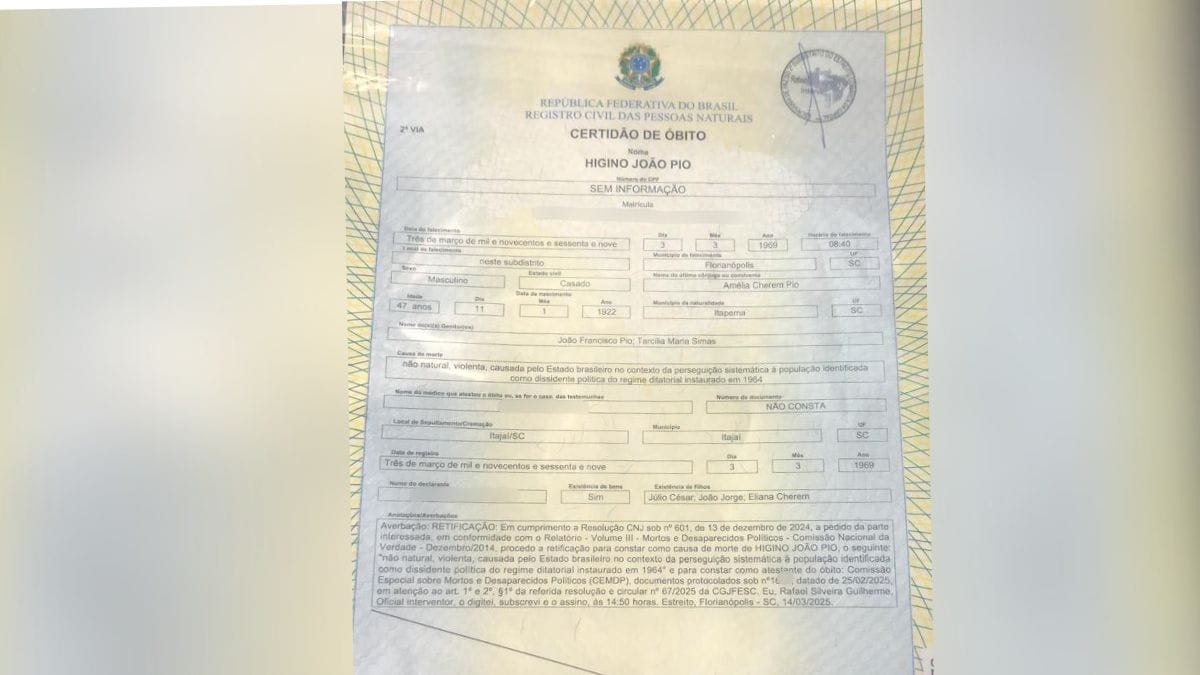 A certidão de óbito do ex-prefeito de Balneário Camboriú, Higino João Pio, morto durante a ditadura militar, foi atualizada depois de 56 anos da morte do político.
