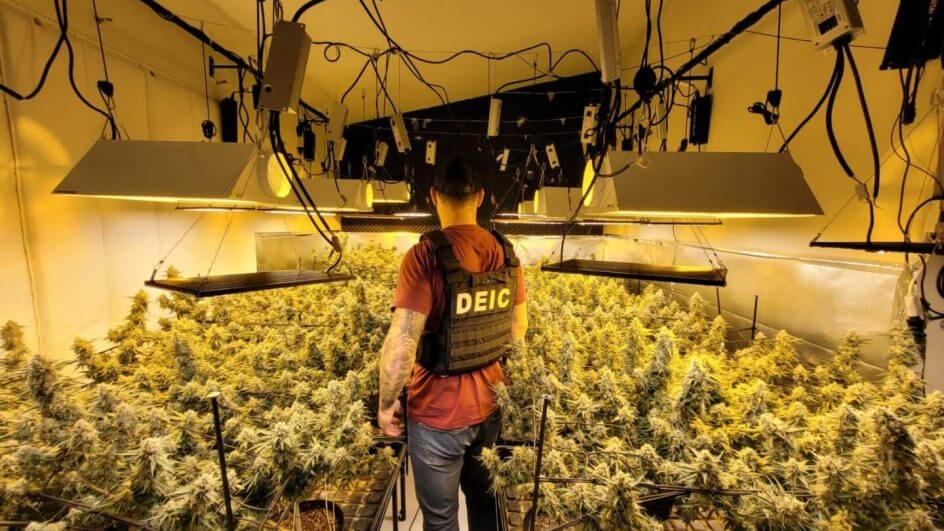 Um mandado de busca e apreensão expedido pela Justiça autorizou a entrada nas residências e confirmou as suspeitas. O homem estava em um dos imóveis quando a polícia chegou e ao tentar fugir acabou caindo da sacada, mas não se feriu com gravidade. Imagens mostram que as plantas já estavam grandes, algumas com meio metro de altura, prontas para comercialização.