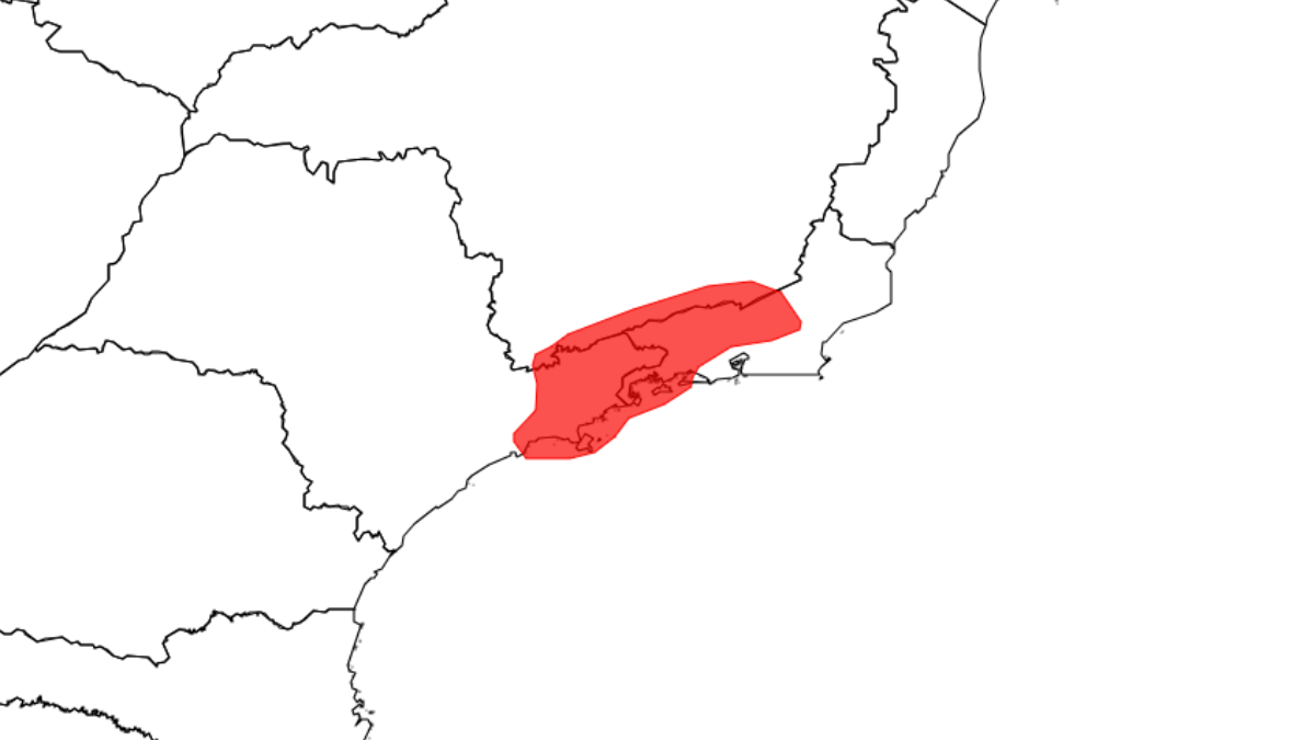 O alerta é válido a partir de 12h de terça-feira (16). A previsão indica chuva acima de 100 milímetros por dia, além de grande risco para alagamentos, transbordamentos de rios e deslizamentos de encostas.