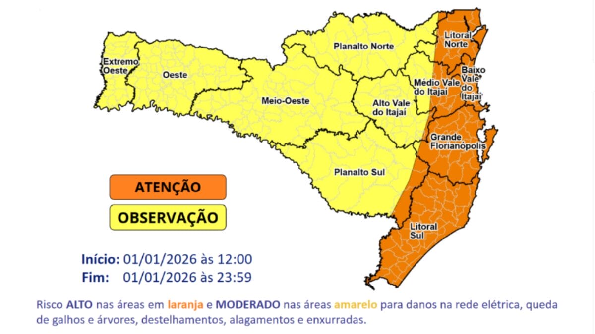 O alerta indica chuvas que podem chegar a 100 milímetros por dia e ventos intensos de até 100 km/h. Há chances de corte de energia elétrica, queda de galhos de árvores, alagamentos e descargas elétricas.