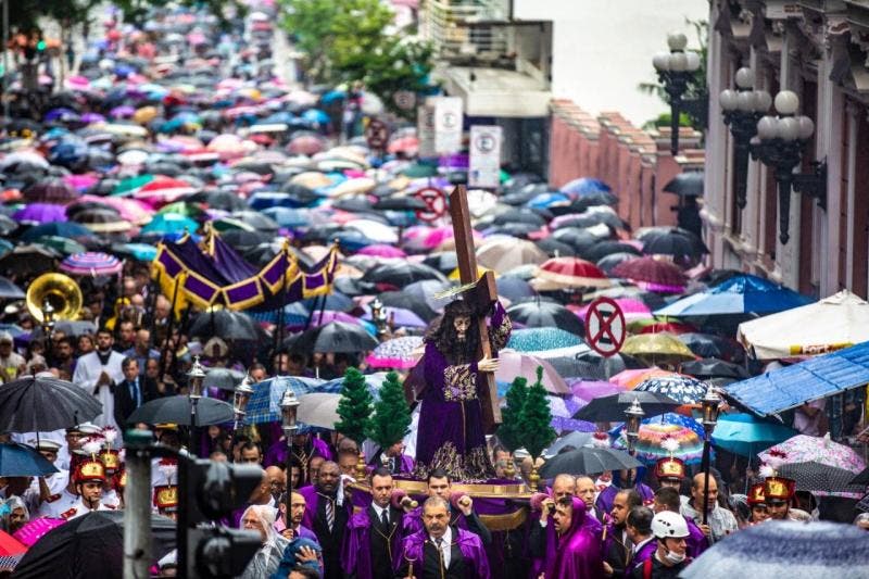 A chuva e o friozinho em Florianópolis não atrapalharam milhares de fiéis na Procissão do Senhor dos Passos neste domingo (7), no Centro da Capital. A comissão organizadora estima que cerca de 45 mil pessoas participaram dos dois dias de evento religioso.