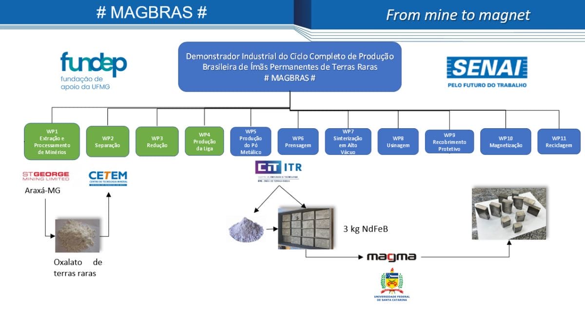 A produção de ímãs permanentes com uso das terras raras teve início no Brasil, ainda em caráter de pesquisa. O projeto MagBras, que é pioneiro no país, conta com ajuda de empresas do Norte catarinense, como WEG, Tupy e Schulz.