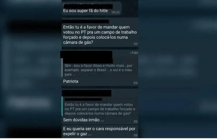 Ele também se pronunciou contra o PT e quem votou no candidato petista no último domingo (30). Depois de proferir uma série de falas em apologia ao nazismo, o professor foi questionado por outro membro do grupo se era favorável a mandar os eleitores da legenda para uma câmara de gás.