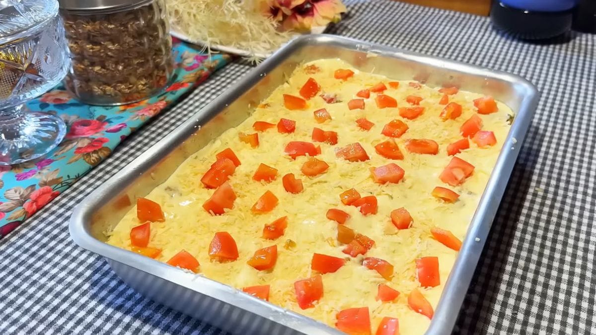 Cubra com o restante da massa e espalhe uniformemente. Finalize salpicando queijo ralado, pedaços de tomate, orégano e salsinha a gosto.