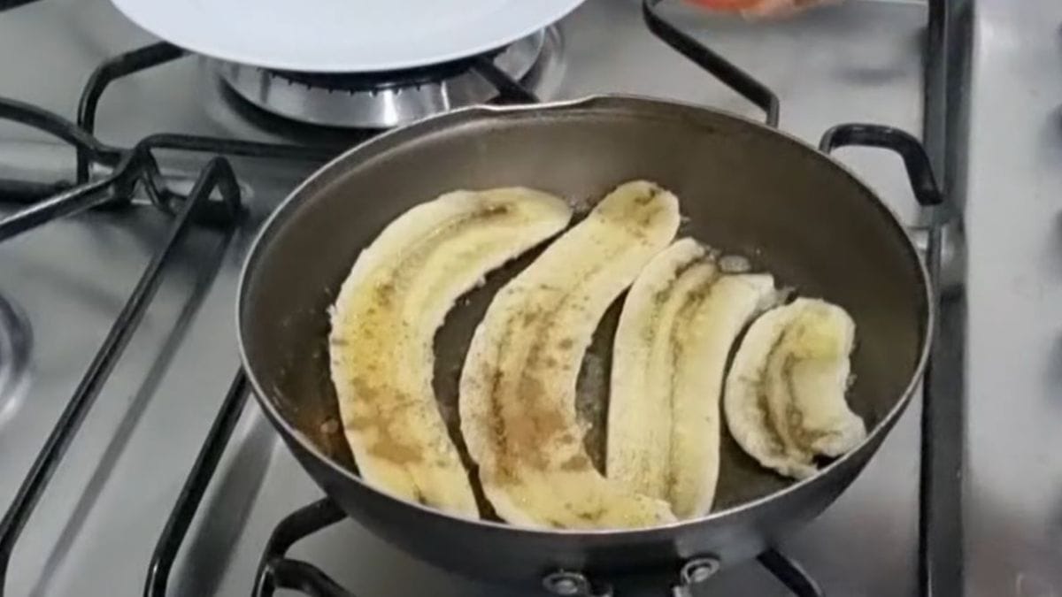 Em uma frigideira aquecida com um pouco de manteiga, coloque as fatias de banana na base. Se desejar, polvilhe uma pitada de canela sobre as bananas.