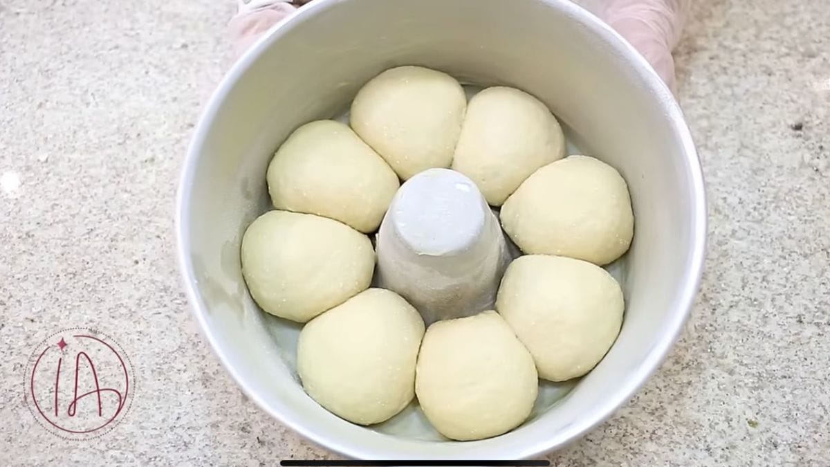 Unte uma forma com manteiga e farinha e coloque as bolinhas, deixando um espaçamento entre elas. Cubra e deixe crescer por mais cerca de 50 minutos. Pré-aqueça o forno a 180°C.