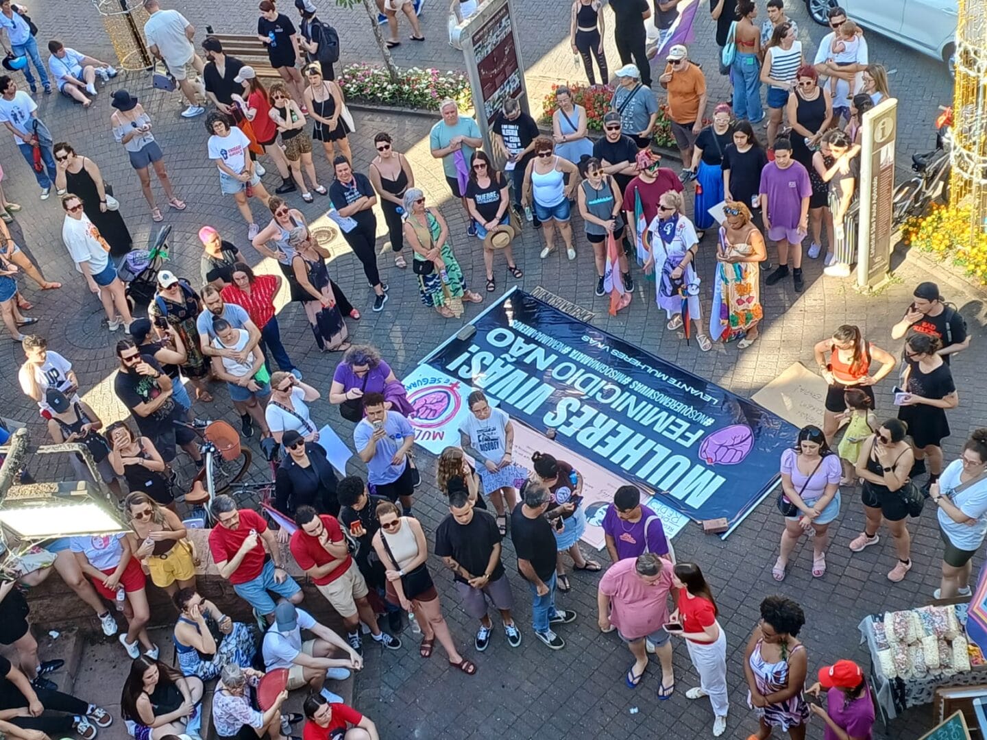 Aos pés da Catedral São Paulo Apóstolo, no Centro de Blumenau, uma súplica estampada em letras brancas no cartaz preto dizia: “Mulheres Vivas. Feminicídio Não”. O protesto começou às 16h, com uma conversa, e depois seguiu com uma passeata pela Rua XV de Novembro.