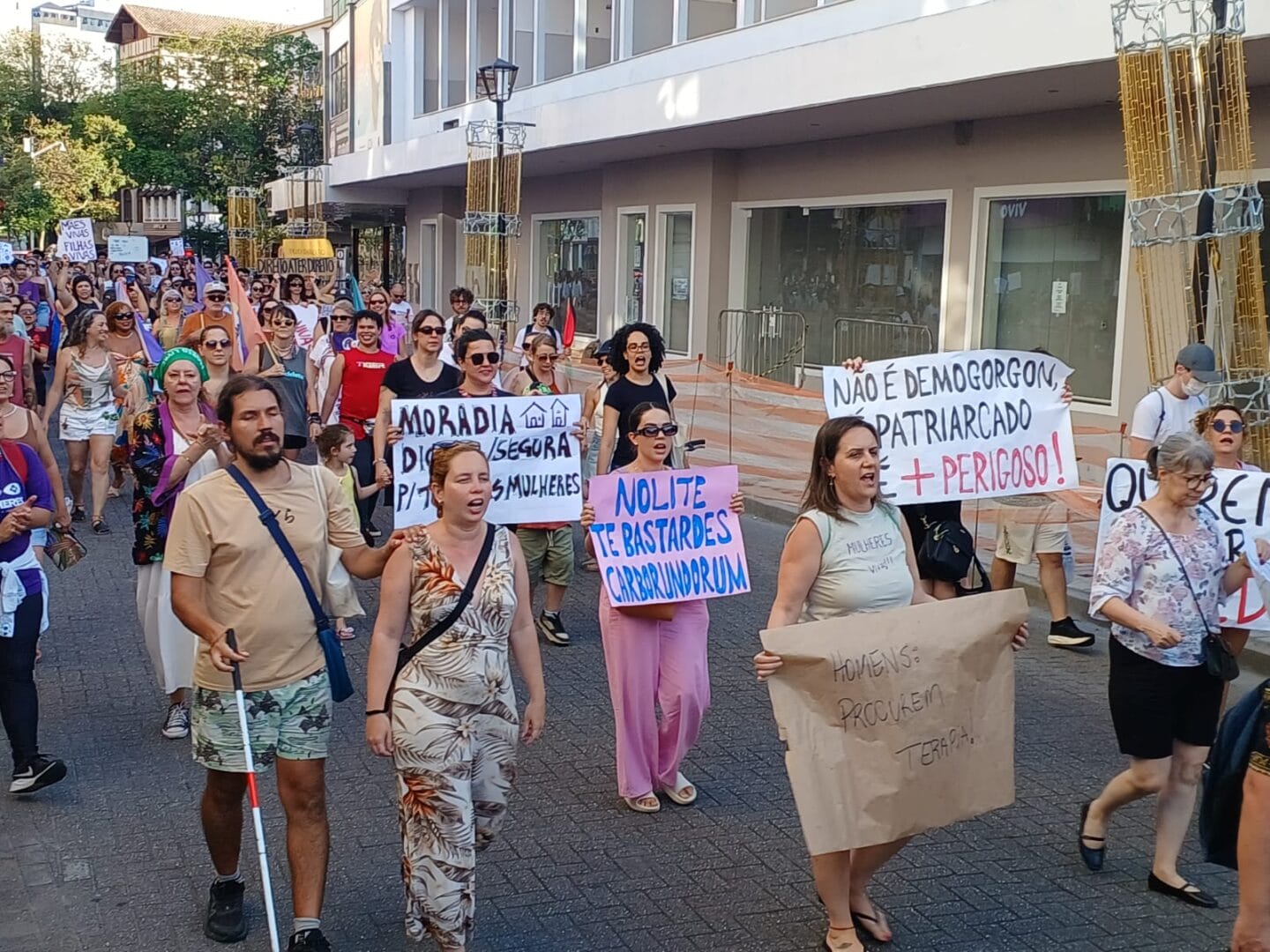Grupos de manifestantes foram às ruas em várias cidades do Brasil neste domingo (7) para pedir o fim dos feminicídios. Os protestos foram convocados pelo movimento Levante Mulheres Vivas. Em Santa Catarina, municípios como Blumenau, Florianópolis e Chapecó tiveram atos.