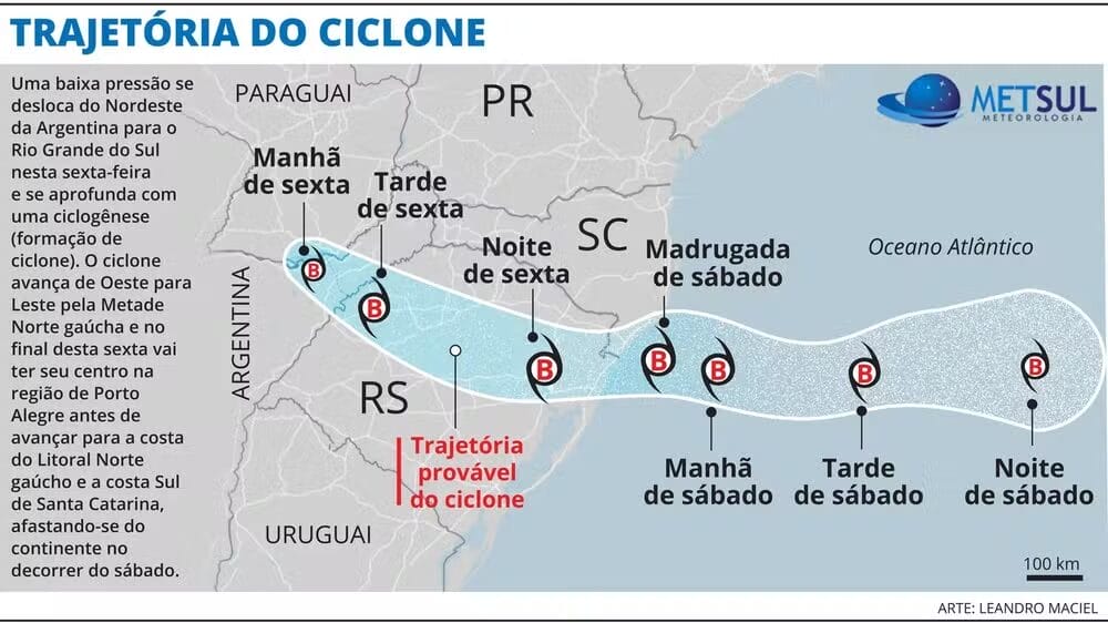 De acordo com o MetSul, no Rio Grande do Sul, o ciclone deve ingressar pelo noroeste do estado na manhã de sexta-feira (7), alcançar a Grande Porto Alegre à noite e seguir em direção ao Litoral Norte entre a madrugada e a manhã de sábado. As rajadas de vento podem ultrapassar os 100 km/h, especialmente em áreas serranas e litorâneas. O Inmet alerta, ainda, para acumulados elevados de chuva, com risco de alagamentos, transbordamento de rios e deslizamentos de encostas.