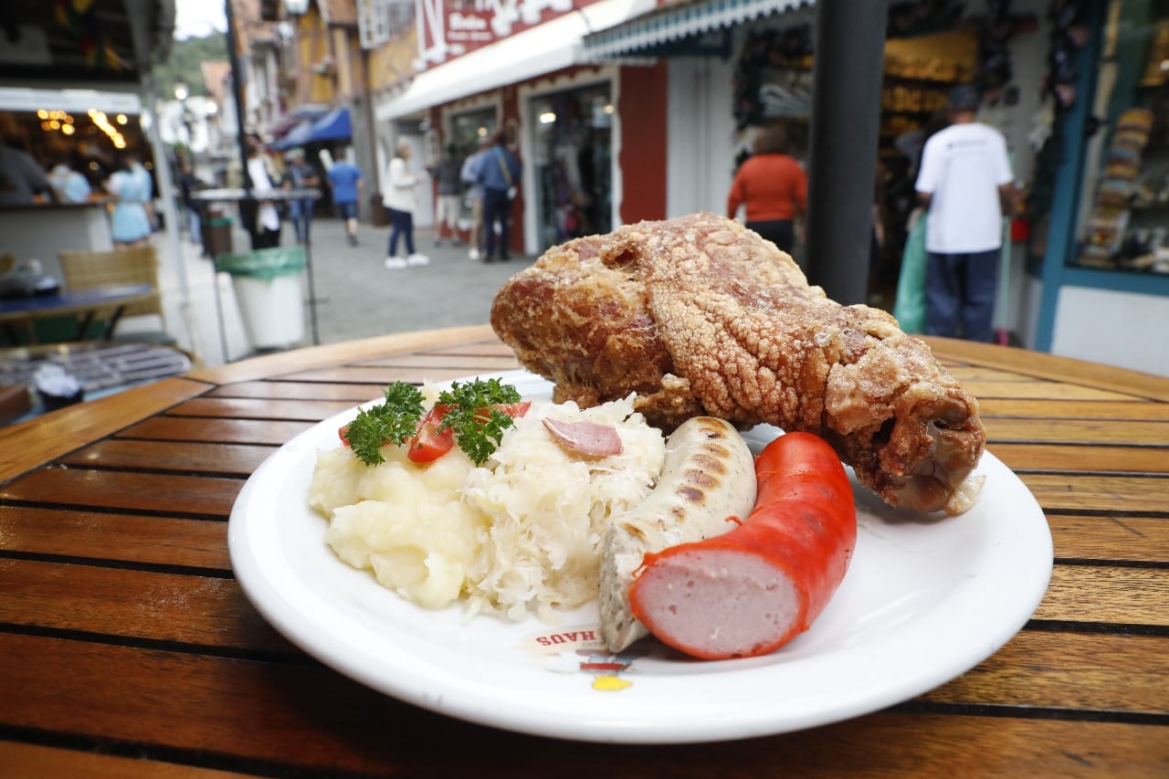 - Schlachtplatte – Joelho de porco a pururuca, salsichas alemãs, Kassler, repolho roxo, chucrute e purê de batata: R$ 180. Onde encontrar: Restaurante Bierhaus.