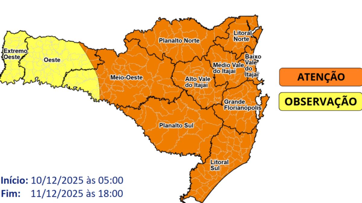 Em Santa Catarina, são esperadas rajadas entre 60 e 80 km/h do Meio-Oeste ao Litoral, enquanto nas áreas serranas próximas ao mar o valor pode se aproximar dos 100 km/h.