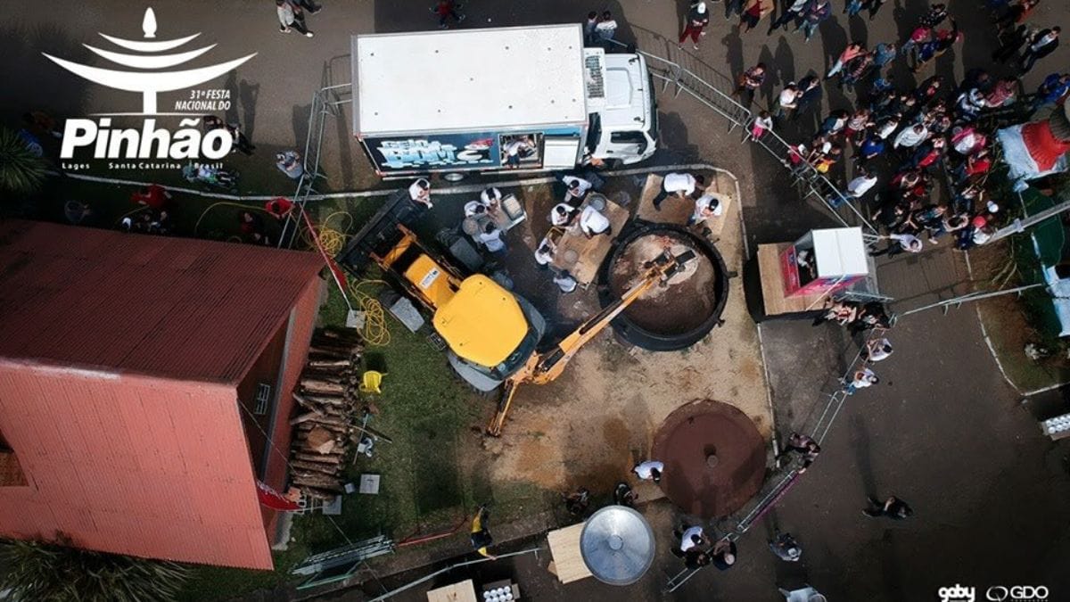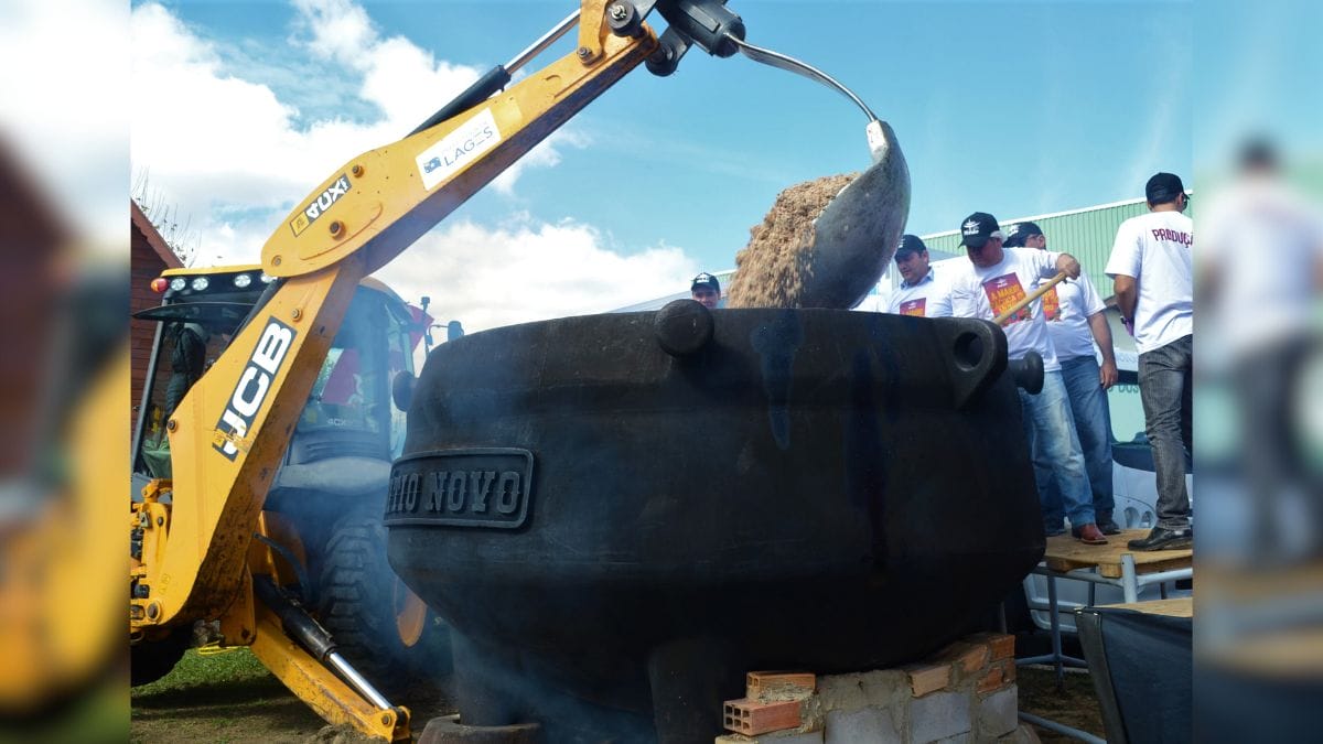 Foram usadas mais de duas toneladas de pinhão, misturadas a carnes e temperos típicos da região. O preparo foi tão grandioso que exigiu uma retroescavadeira adaptada para mexer os ingredientes, cozidos em um enorme fogão a lenha.