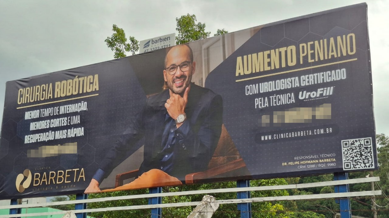 Um outdoor em uma das ruas mais movimentadas de Blumenau tem chamado a atenção. Afinal trata de um assunto que mexe com o imaginário masculino: o aumento peniano. Sim, o tema é motivo para muitas brincadeiras, a gente sabe. Mas o fato é que diariamente chegam várias mensagens no número de contato divulgado no anúncio. E o céu é o limite para as dúvidas.