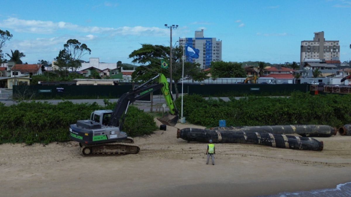 Foi feita na segunda-feira (19) uma das etapas mais importantes das obras de alargamento da praia de Balneário Piçarras: o lançamento da linha de recalque da tubulação, que será executado em três pontos ao longo da orla.