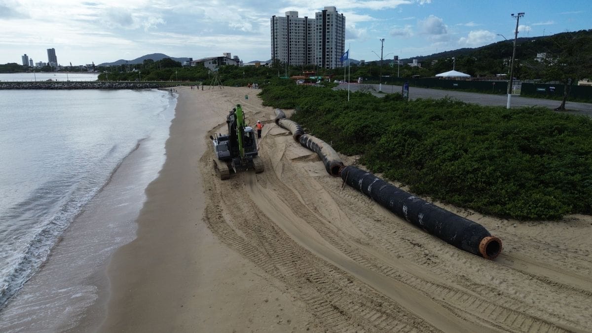 Com a chegada da draga, os tubos serão distribuídos para a formação do duto principal subaquático, responsável por transportar a areia da jazida até a praia. O sedimento possui as mesmas características da areia existente — exigência para obtenção da licença ambiental — e será retirado de uma jazida localizada a aproximadamente 10,5 quilômetros da Praia Central, próximo à Ponta da Vigia, no município de Penha.