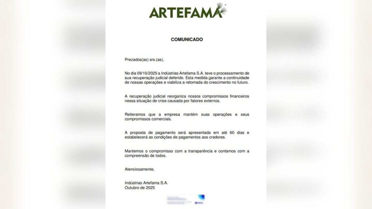 A Artefama, empresa de móveis de São Bento do Sul, cidade do Planalto Norte catarinense, teve a sua recuperação judicial aprovada. O anúncio foi enviado nesta quinta-feira (9) aos quase 400 funcionários demitidos no dia 17 de setembro, devido aos impactos negativos causados pelo tarifaço dos Estados Unidos. O comunicado também prevê o pagamento das rescisões contratuais, que, quase um mês após o caso, ainda não foram pagas.
