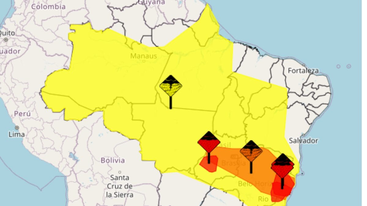 O aviso é válido para estados da região Sudeste (como Minas Gerais, Rio de Janeiro e Espírito Santo) e Centro-Oeste (Goiás). Segundo o Inmet, há chances de chuvas de mais de 100 milímetros por dia, com grande risco para alagamentos, transbordamento de rios e deslizamentos de encostas.