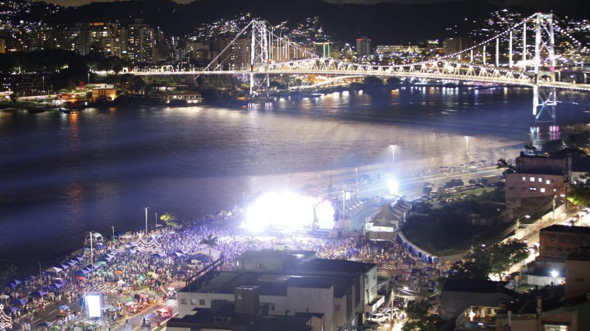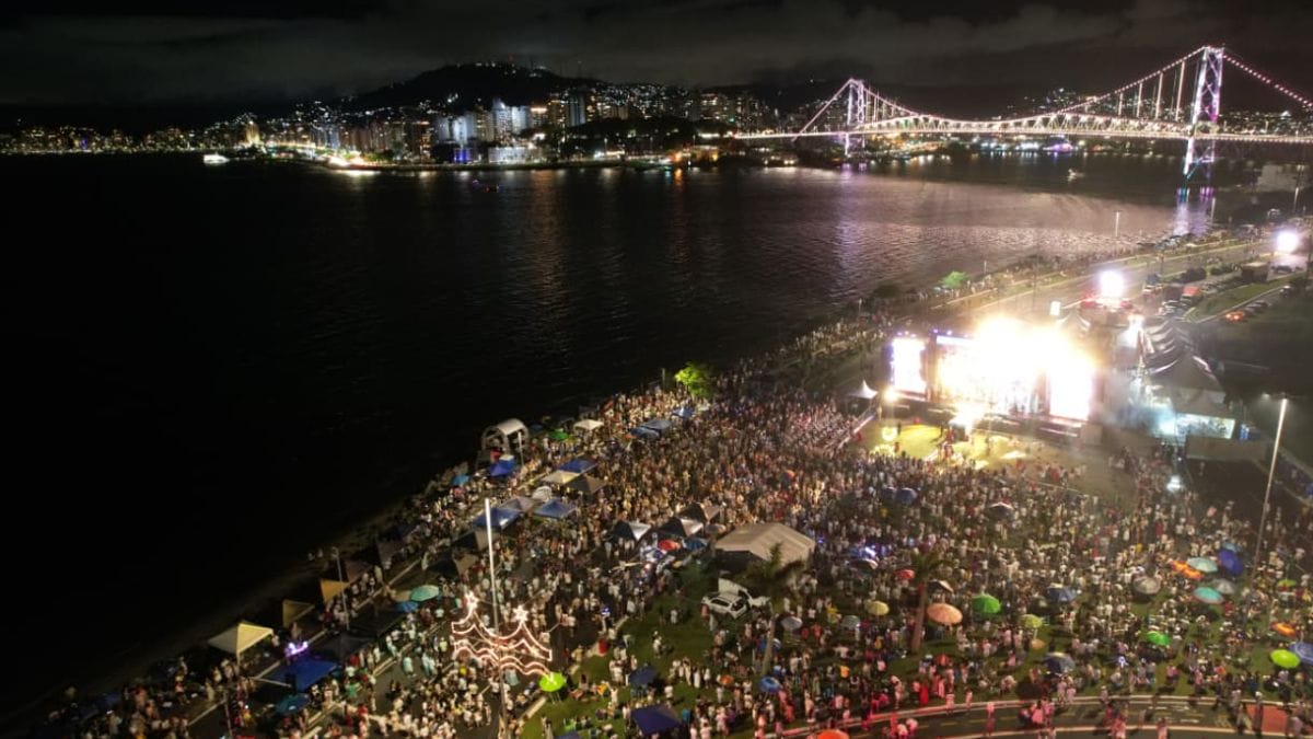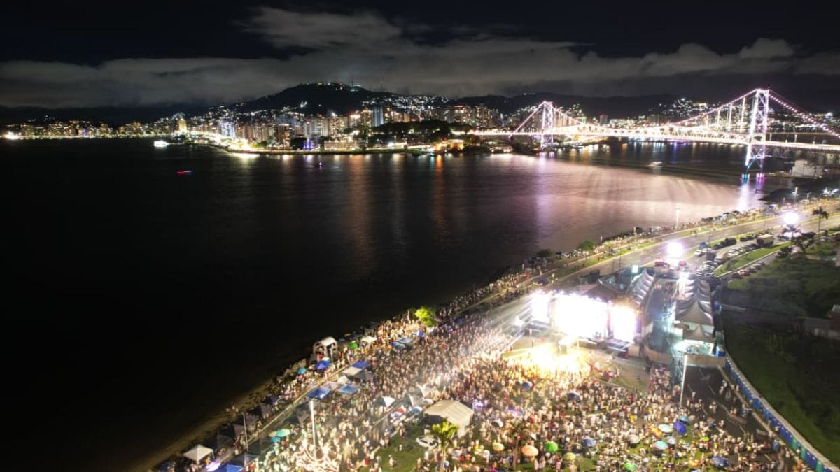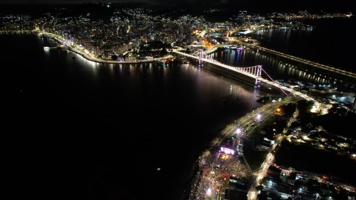 Shows nacionais, queima de fogos e cascata na Ponte Hercílio Luz marcaram a chegada de 2026 em Santa Catarina. No Estado, milhares de pessoas se reuniram nas principais praias e centros de Florianópolis, Balneário Camboriú, Blumenau, Joinville, São Francisco do Sul e outras cidades para celebrar o Ano-Novo.
