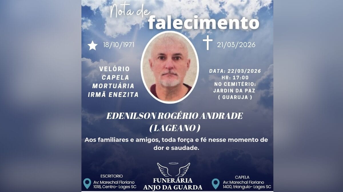 A Funerária Anjo da Guarda emitiu uma nota de falecimento comunicando a morte de Edenilson. Ele foi velado na Capela Mortuária Irmã Enezita e o sepultamento aconteceu no Cemitério Jardim da Paz, em Lages, na tarde deste domingo (22).
