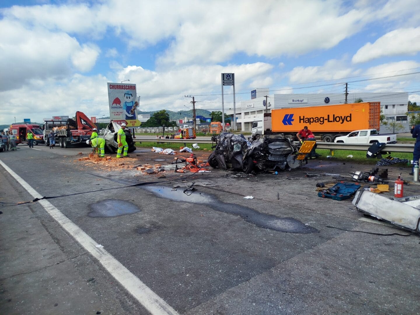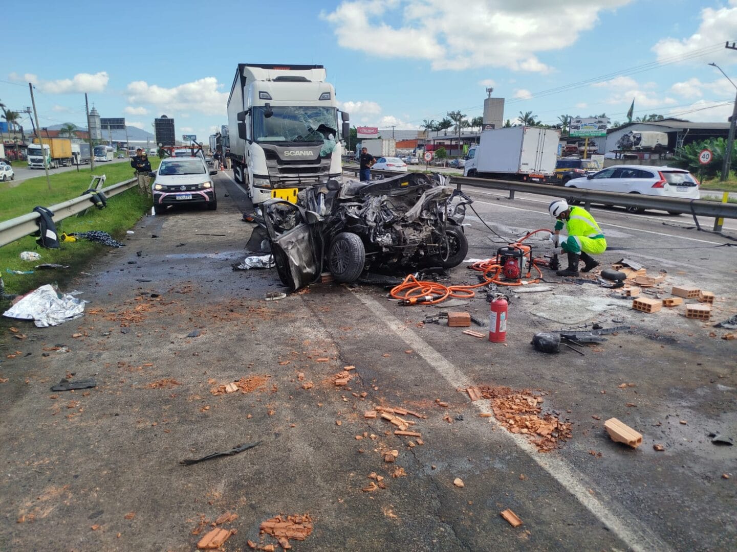 A família estava em um veículo Cronos esmagado por um caminhão durante um engavetamento na BR-101, por volta das 8h40min. Kayo e Camila eram casados e pais do menino que sobreviveu. A criança teve ferimentos graves e nesta tarde estava na UTI do Hospital Pequeno Anjo, em Itajaí, aguardando a chegada do avô. Uma equipe com psicóloga e assistente social acompanha o garoto.