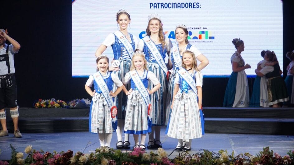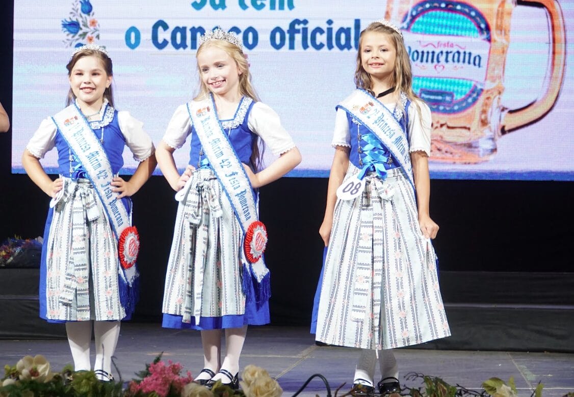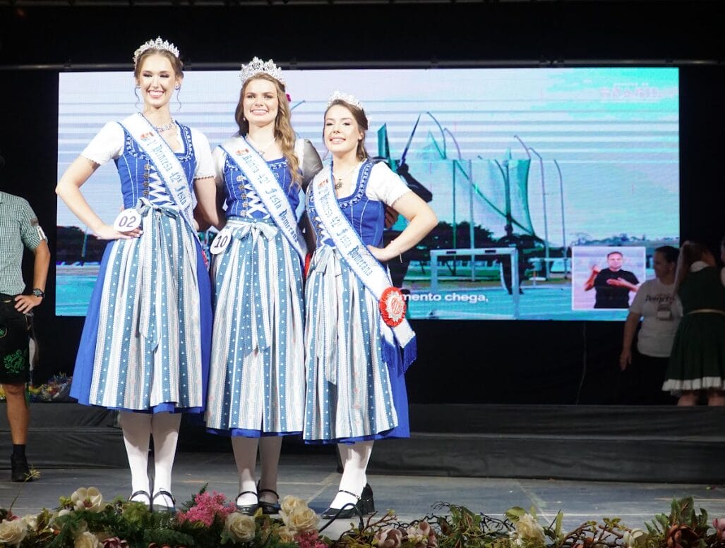 A nova realeza da Festa Pomerana foi definida neste domingo (25), último dia do evento de 2026. Para 2027, representam a 42ª edição a rainha Camile Sabin Barg, a primeira-princesa Giovana Beatriz Rahn e da segunda-princesa Kétlin Caroline Tribéss.