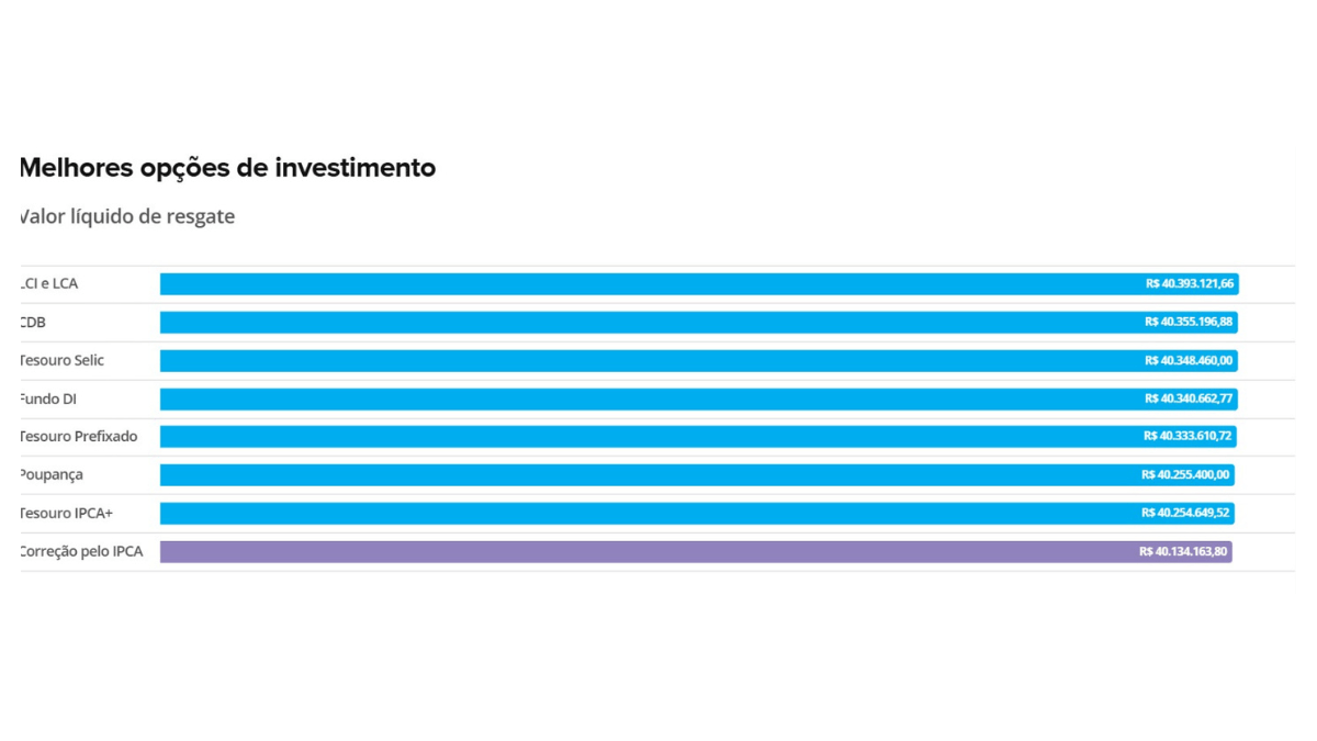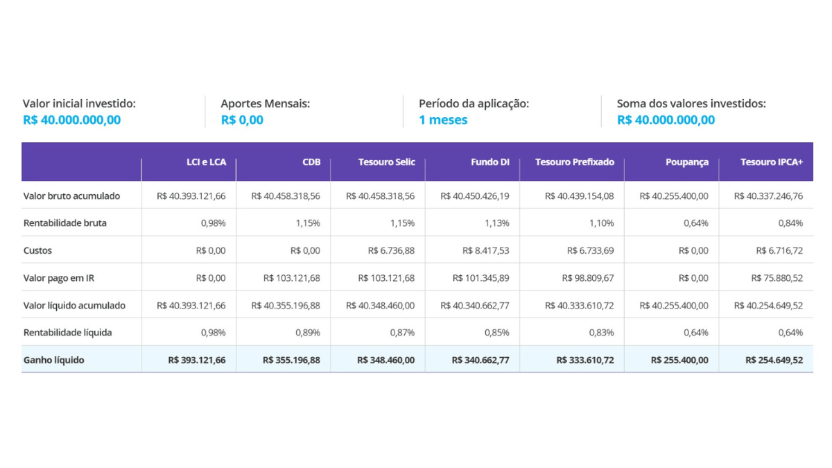 O valor de R$ 40 milhões da Dupla de Páscoa investidos nesses títulos renderia no primeiro mês R$ 393 mil. Assim como a Poupança e diferente do Tesouro Selic e do CDB, a LCI e a LCA estão isentas de Imposto de Renda.