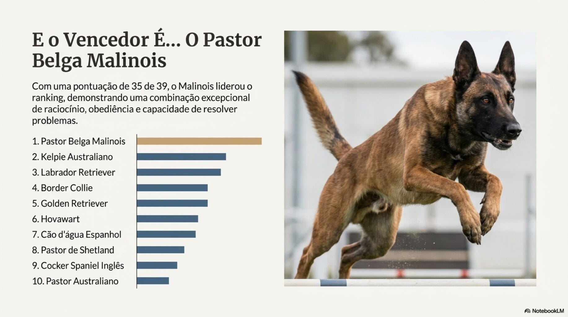 O grande destaque foi o Pastor Belga Malinois, que alcançou 35 dos 39 pontos possíveis, conquistando o topo da lista e sendo classificado como a raça mais inteligente do mundo na pesquisa.