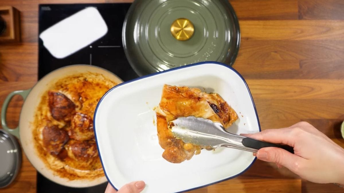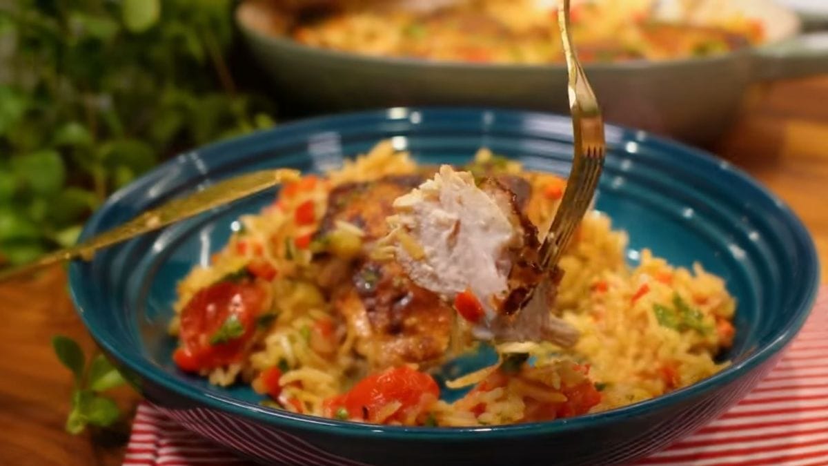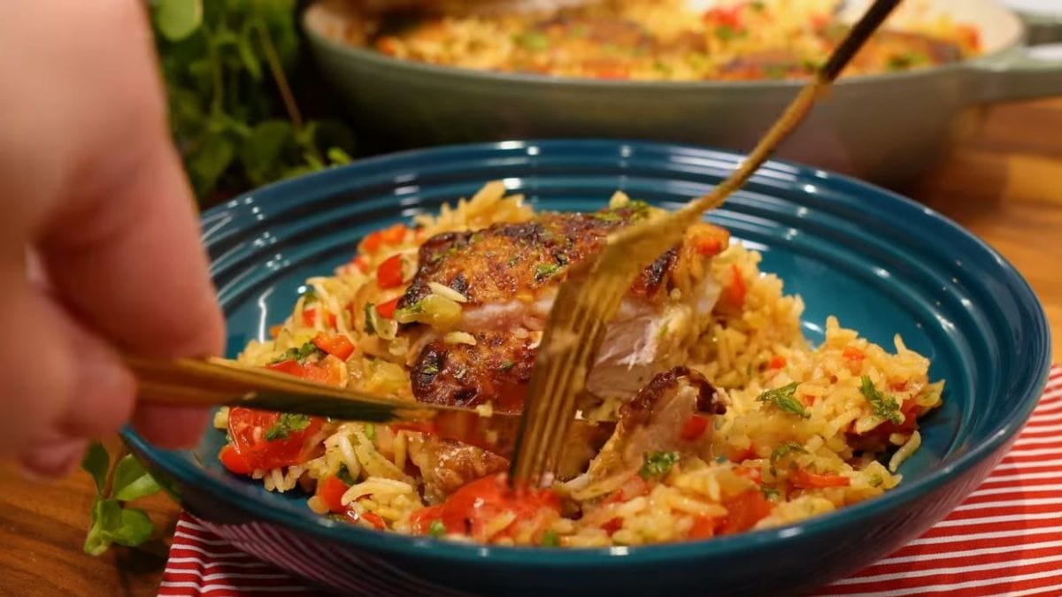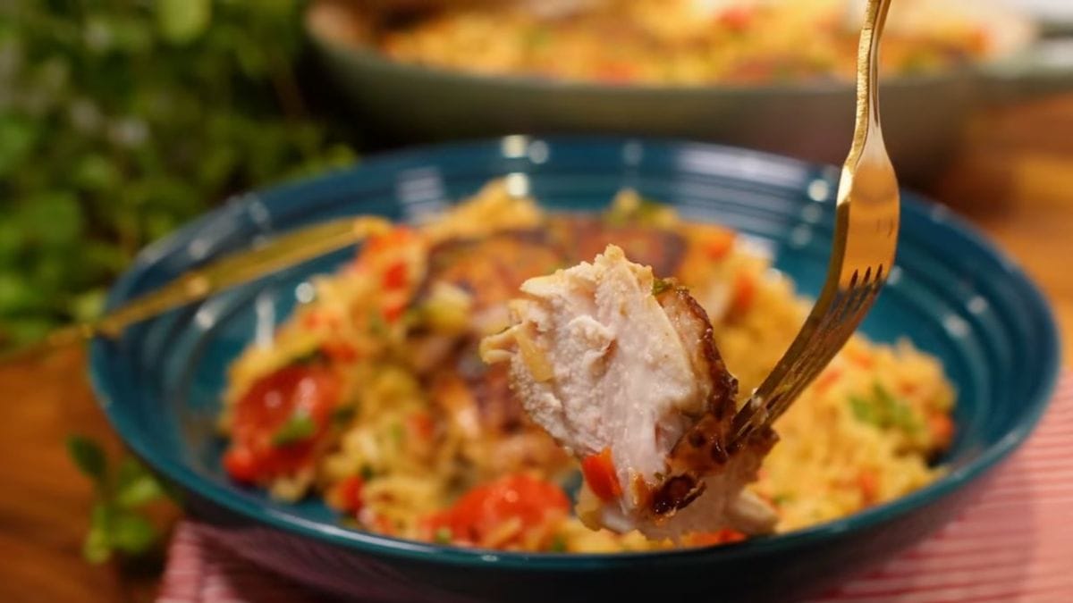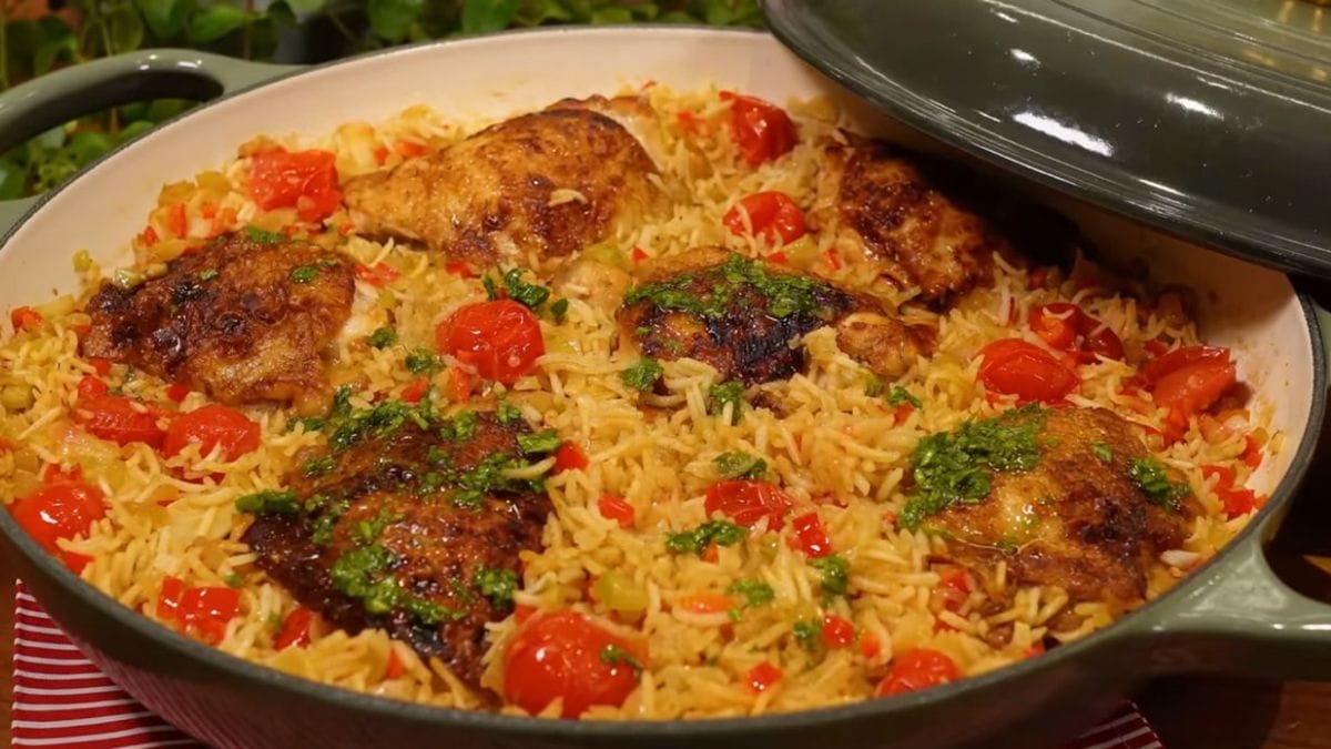 Recoloque o frango sobre o arroz, pele para cima, e tampe a panela. Cozinhe em fogo baixo sem mexer por cerca de 15 minutos até o arroz ficar cozido. Desligue o fogo e deixe a panela descansar tampada por 10 minutos.