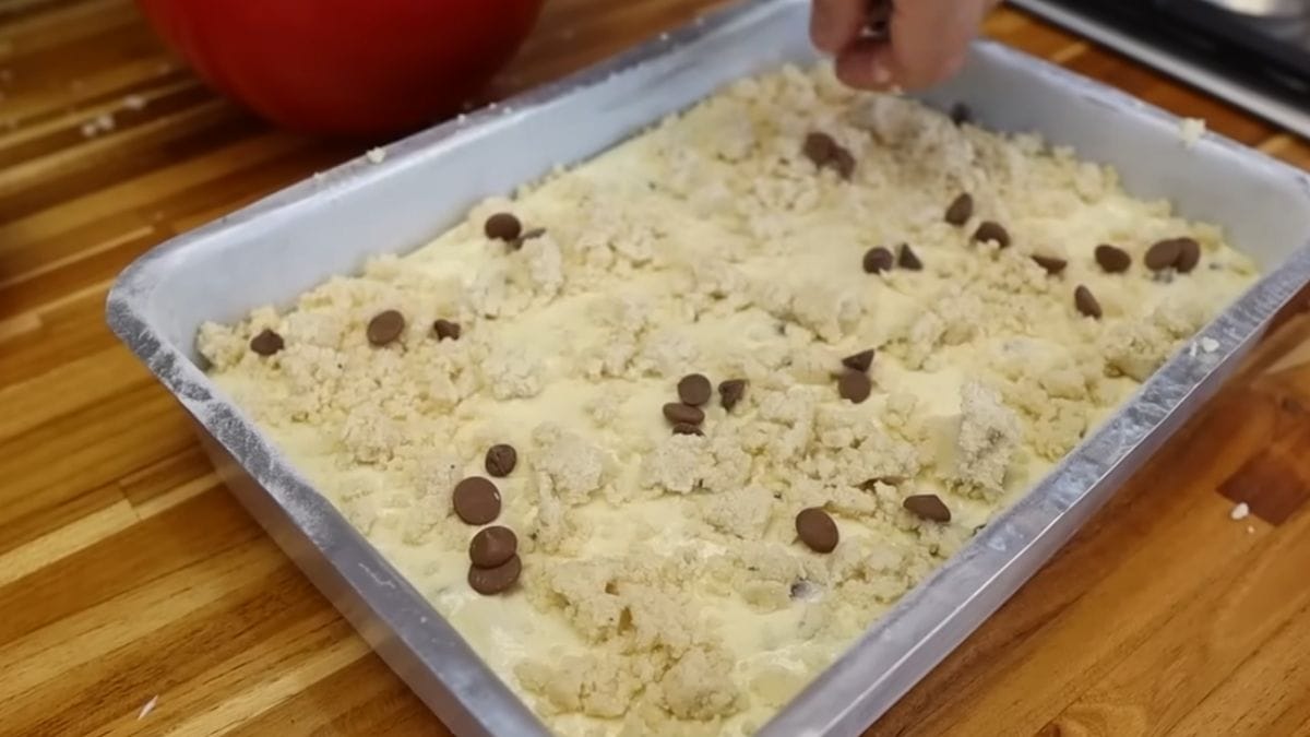 Especialmente popular no Rio Grande do Sul e em Santa Catarina, com raízes na imigração alemã do século XIX, a cuca foi inspirada no kuchen alemão, que significa “bolo” em dialeto germânico. O prato evoluiu para uma versão brasileira com massa leve, recheios variados e farofa crocante por cima, adaptando-se a ingredientes locais como goiabada, frutas ou, nesta receita, gotas de chocolate.