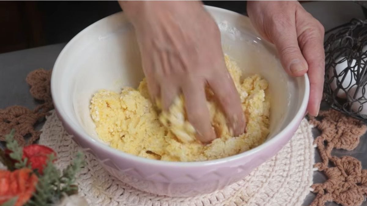 Primeiro, misture a manteiga derretida e o açúcar em um recipiente. Em seguida, acrescente o fubá e o amido de milho. Mexa novamente.