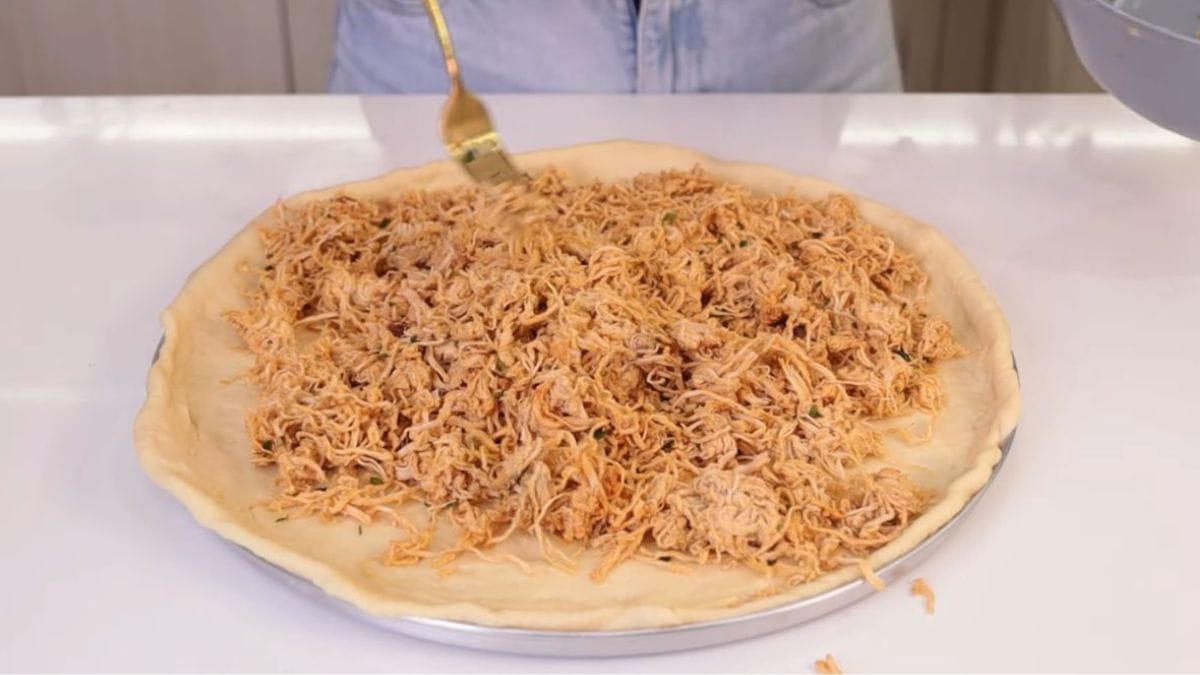 Forme uma bola, cubra e deixe descansar até dobrar de volume. Para o recheio, desfie e refogue o frango cozido com temperos. Abra a maior parte da massa em disco fininho, forre a forma e distribua o frango, requeijão, cebola, tomate e queijo, deixando borda livre.