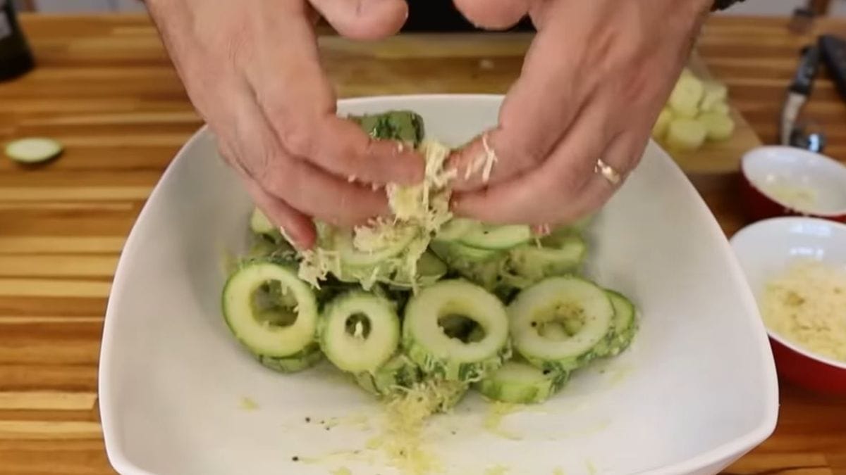 Primeiro corte as abobrinhas em rodelas. Agora, retire o miolo de cada rodela. Coloque os anéis de abobrinha em um recipiente e adicione o azeite, parmesão ralado e a pimenta-do-reino e misture bem.