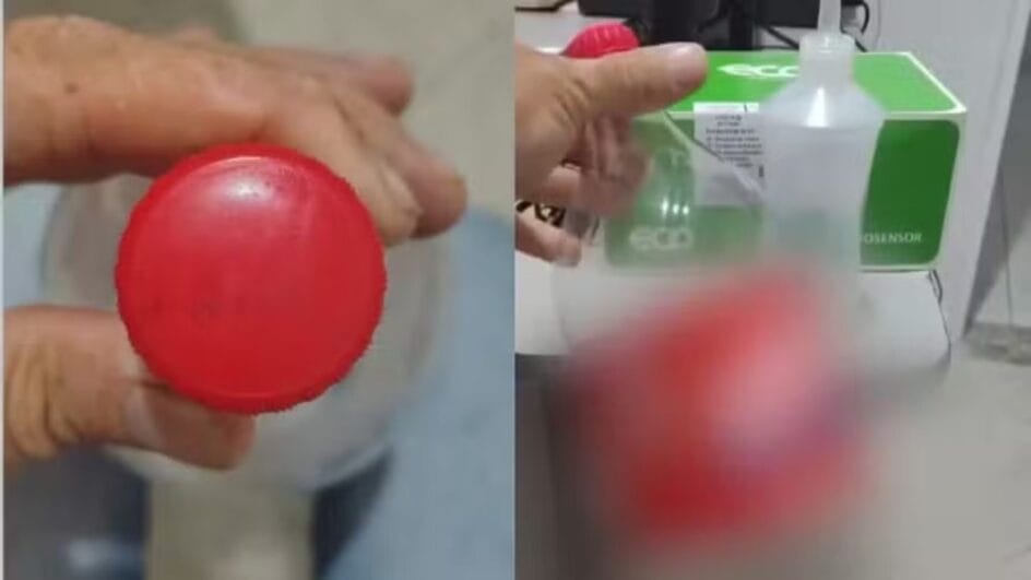 Outro ponto observado é que as informações de validade e lote da bebida estavam apagadas — dados que normalmente ficam registrados na tampa da garrafa.