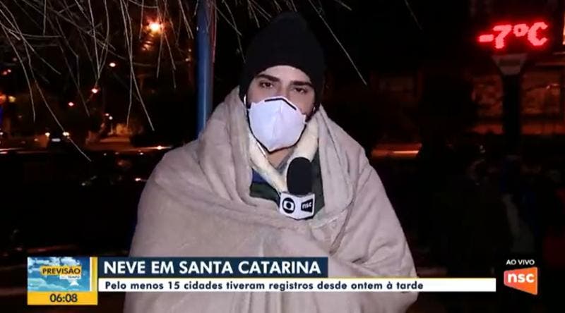 O frio congelante da Serra catarinense na madrugada desta quinta-feira (29) fez com que muita gente aproveitasse para ficar enrolado no cobertor. Com o repórter da NSC TV, Douglas Márcio, não foi diferente. Ele viralizou nas redes sociais após fazer sua entrada ao vivo, enrolado em um cobertor, durante o Bom Dia SC.